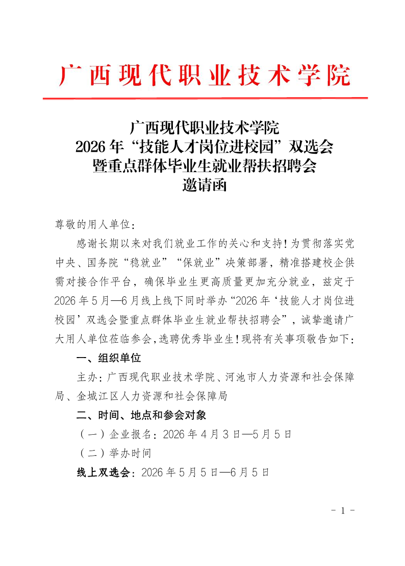 广西现代职业技术学院2026年“技能人才岗位进校园”双选会暨重点群体毕业生就业帮扶招聘会邀请函 来源:学校就业处 发布时间:2026-04-14 17:23:57 浏览次数: 次 【字体:小 大】 终审:gxxdjyc001 【打印正文】 相关信息